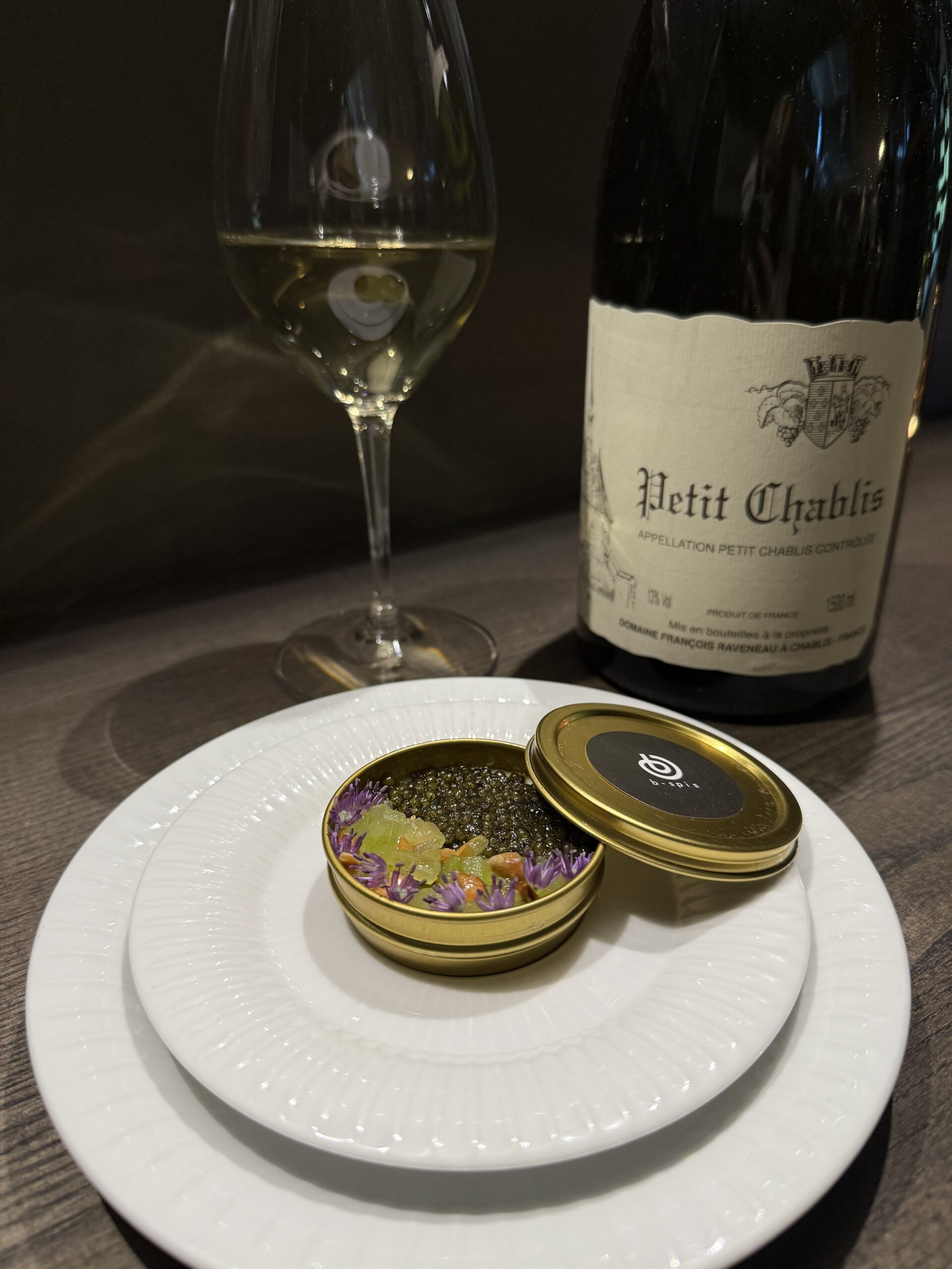 – Panna Cotta på peberrod, caviar, agurk, mandel