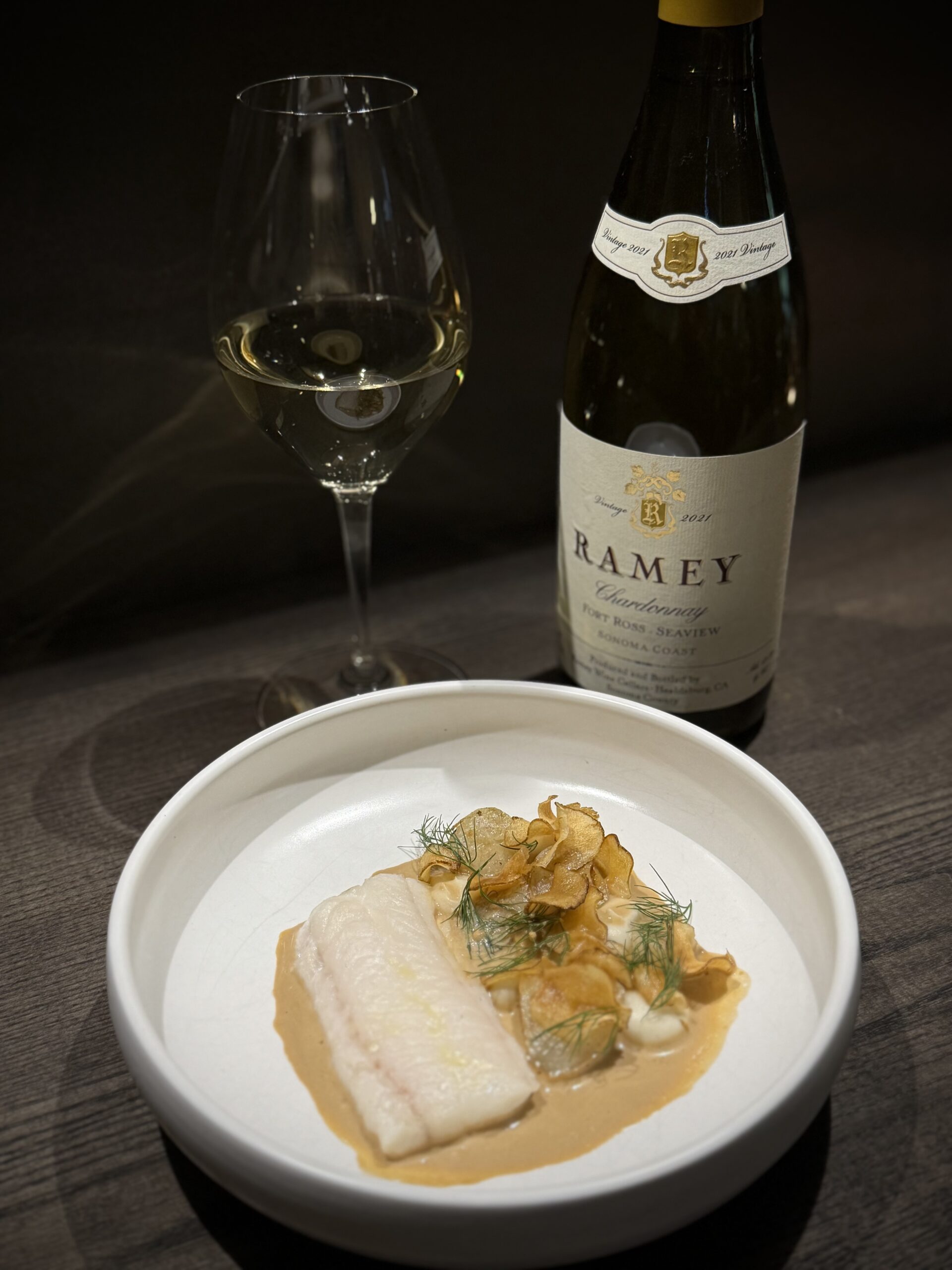 – Bagt hvid fisk, jordskokker, creme, hummer-sauce